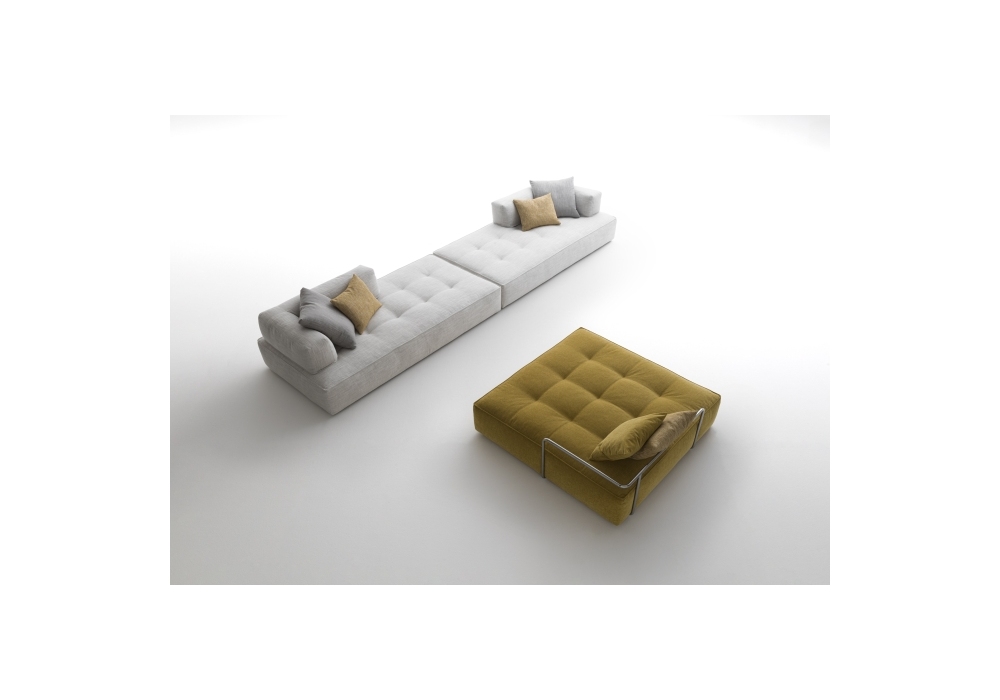 Melvil conçu par Marc Sadler pour Désirée est un canapé modulable réalisé avec une structure en bois et des tubes en métal chromé brillant, un rembourrage en mousse de polyuréthane et un revêtement entièrement déhoussable en tissu ou cuir.