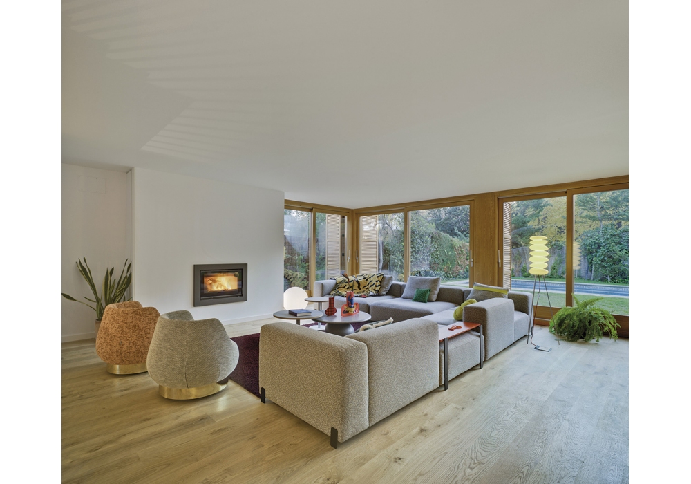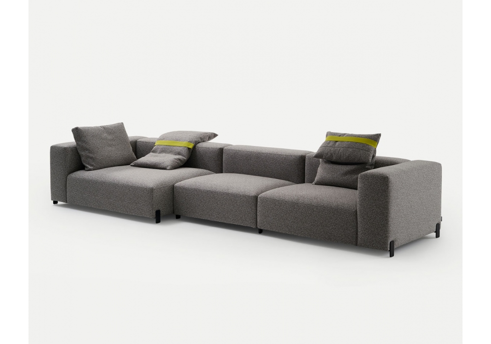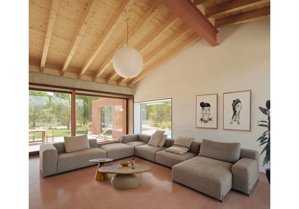 Mousse conçu par Rafa García pour Sancal est un canapé modulable en bois, pieds en acier laqué mat, assise et dossier rembourrés recouverts de tissu ou de cuir. Disponible en différentes finitions, tailles et configurations personnalisées.