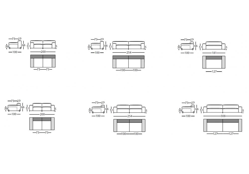 | Dimensions | • 200 x 100 x H 66 cm; • 254 x 100 x H 66 cm; • 127 x 100 x H 66 cm |