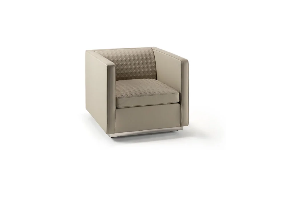 Avantgarde conçu par Reflex Angelo est un fauteuil réalisé avec une structure en bois et un rembourrage en plumes avec insert en mousse de polyuréthane. Piquage San Marco sur les coussins du dossier et de l'assise. Base en acier inoxydable poli.