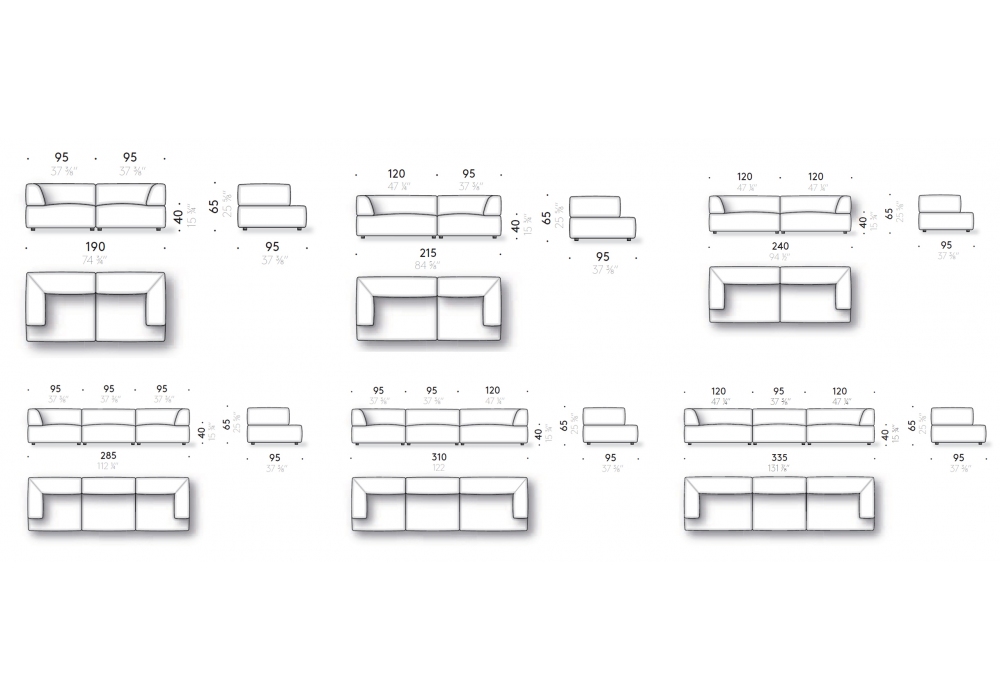 | Dimensions | 190 x 95 x H 65 cm; 215 x 95 x H 65 cm; 240 x 95 x H 65 cm; 285 x 95 x H 65 cm; 310 x 95 x H 65 cm; 335 x 95 x H 65 cm. |