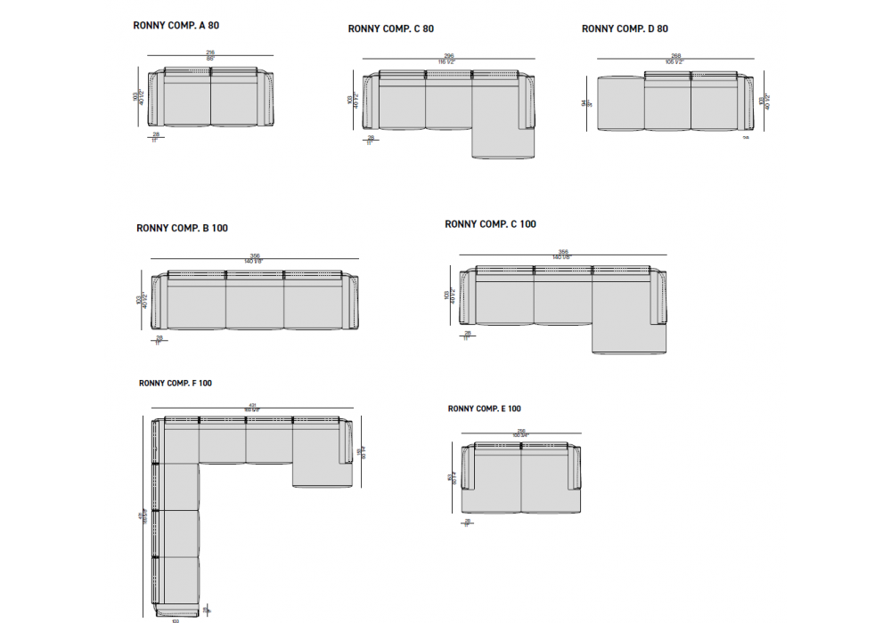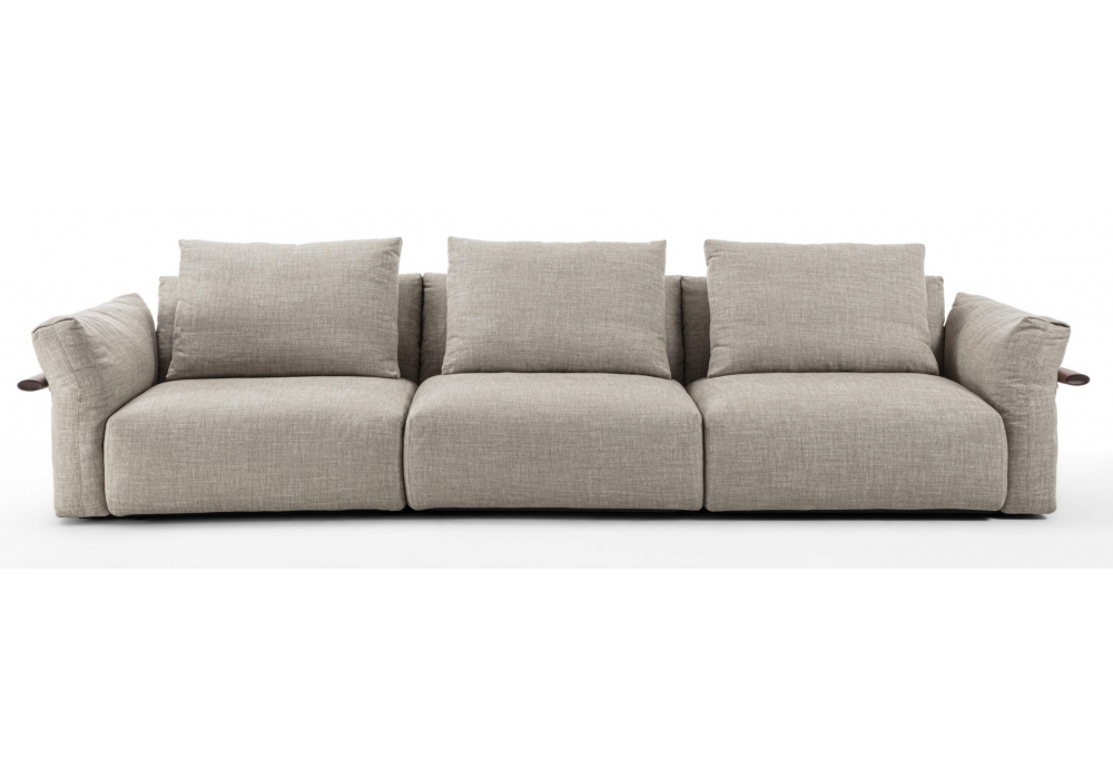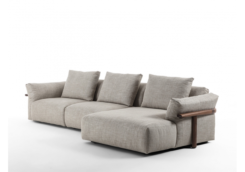 Ronny conçu par G. & O. Buratti pour Porada est un canapé modulable avec piètement en métal gris étain et structure en noyer canaletta. Revêtement en tissu déhoussable et revêtement en cuir fixe.