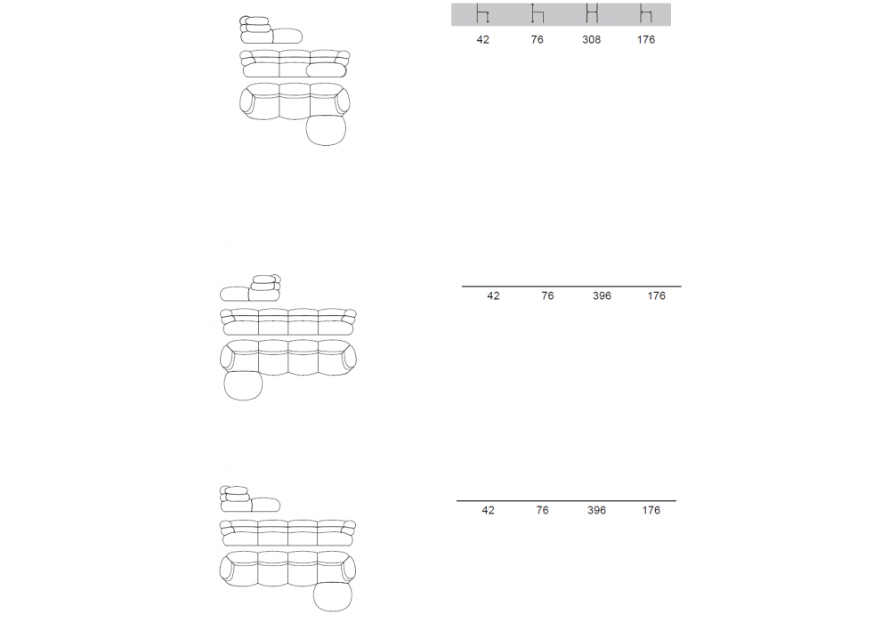 | Dimensions | 200 x 104 x H 76 cm; 308 x 104 x H 76 cm; 396 x 104 x H 76 cm; 308 x 176 x H 76 cm; 396 x 176 x H 76 cm. |