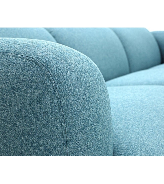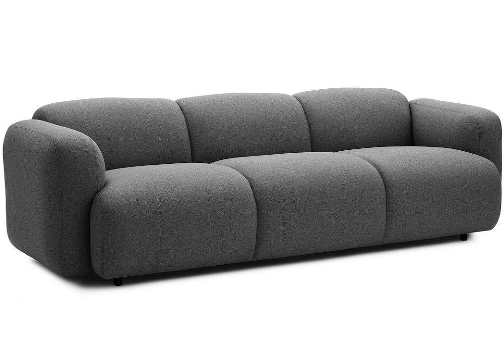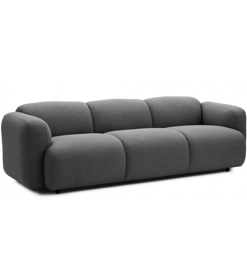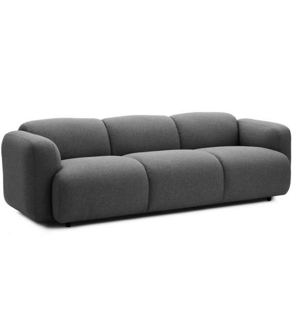 Swell, conçu par Jonas Wagell pour Normann Copenhagen est un canapé à trois places, avec structure en bois et mousse HR recouverte de différents types de tissus. Les pieds sont en bois de frêne verni et laqué.