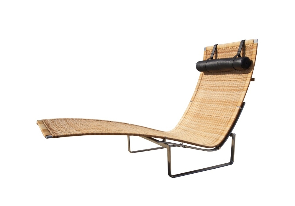 PK24™ conçue par Poul Kjærholm pour Fritz Hansen est une chaise longue en osier avec base en acier inoxydable satiné. Appui-tête en cuir.