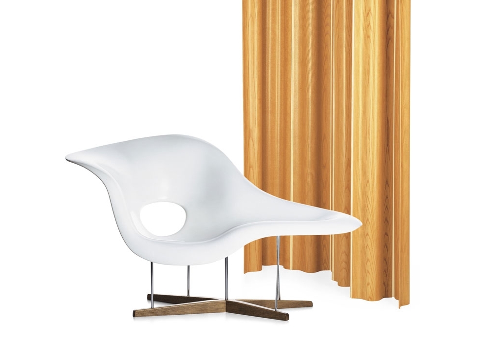 Vitra La Chaise (chaise lounge): Charles et Ray Eames créent La Chaise en 1948 dans le cadre d’un concours du Museum of Modern Art de New York. Ce siège s’inspire de la sculpture « Floating Figure » du sculpteur Gaston Lachaise. Véritable sculpture qui investit l’espace, le siège se distingue par une élégance étonnante et permet de multiples positions assises et couchées. La Chaise est devenue depuis longtemps une icône du design organique.