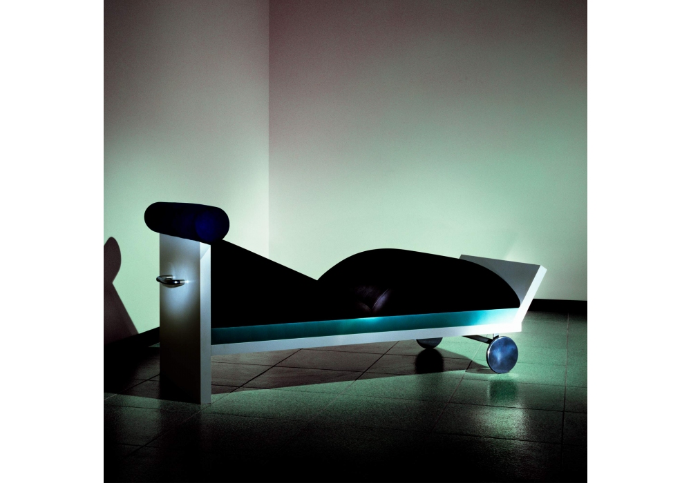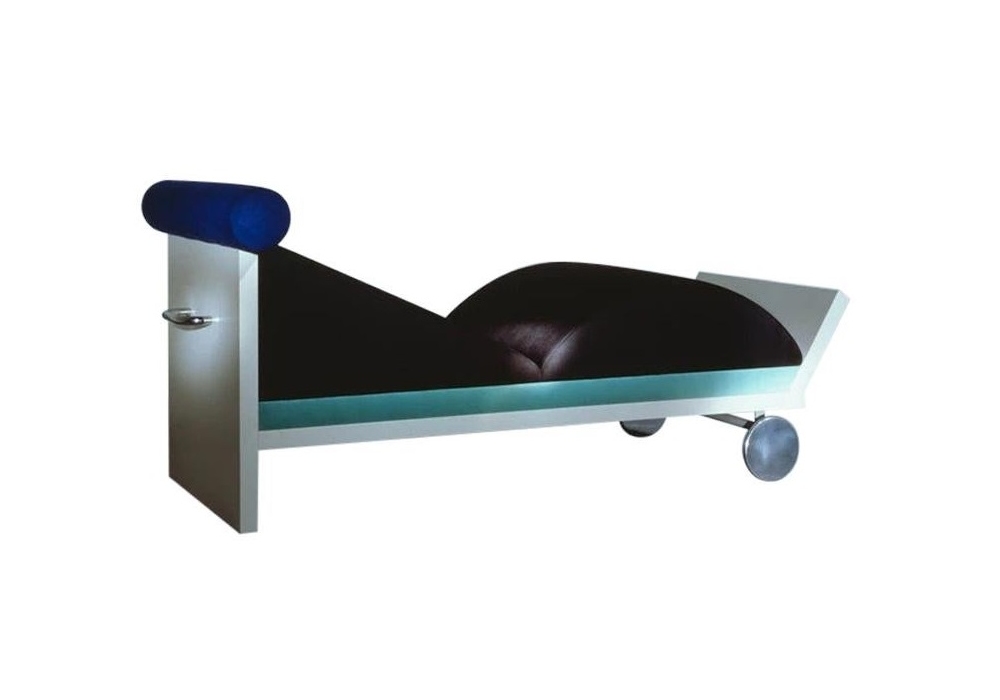 Juan conçue par Marco Zanini pour Memphis Milano est une chaise longue en stratifié plastique, métal et tissu Alcantara.