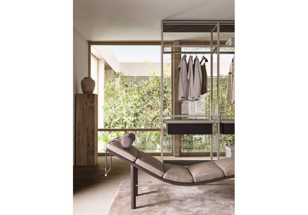 Tuscany conçue par Naoto Fukasawa pour Molteni&C est une chaise longue réalisée avec structure en frêne massif teinté eucalyptus ou chêne sunrise, structure en acier inoxydable satiné ou laiton satiné et revêtement en tissu ou cuir. Coussin d'appui-tête à roulettes en option, avec sangles en cuir.