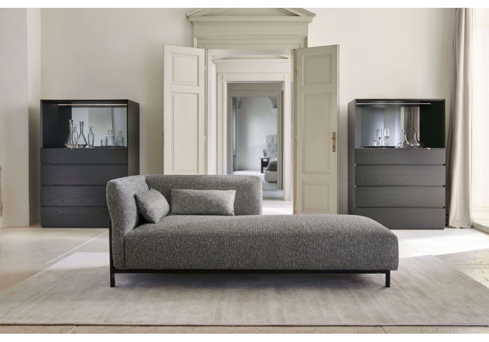 Dominick conçue par Enrico Cesana pour Conte Casa est une chaise longue réalisée avec une structure en bois massif, un rembourrage en mousse de polyuréthane et un revêtement en tissu ou en cuir.