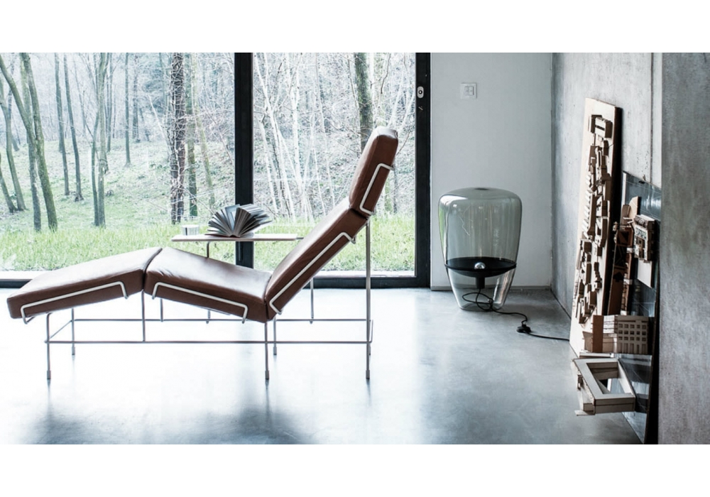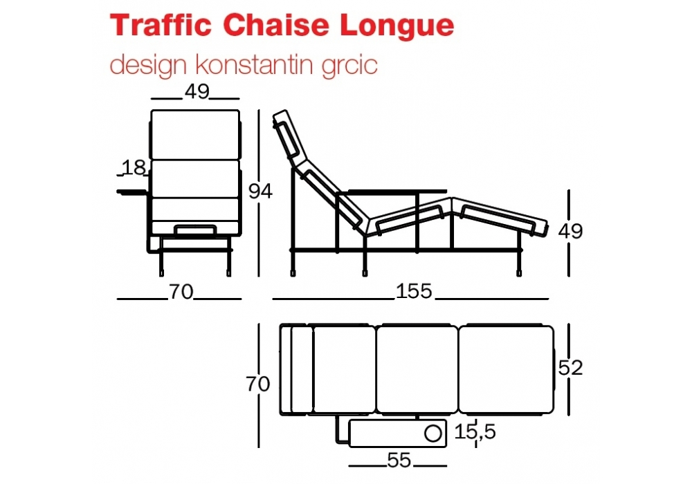 Traffic_2, conçue par Konstantin Grcic pour Magis, est une chaise longue avec structure en tige d'acier peint en polyester. Coussins en mousse de polyuréthane avec revêtement en tissu ou en cuir. Equipée d'une tablette en pierre acrylique.
