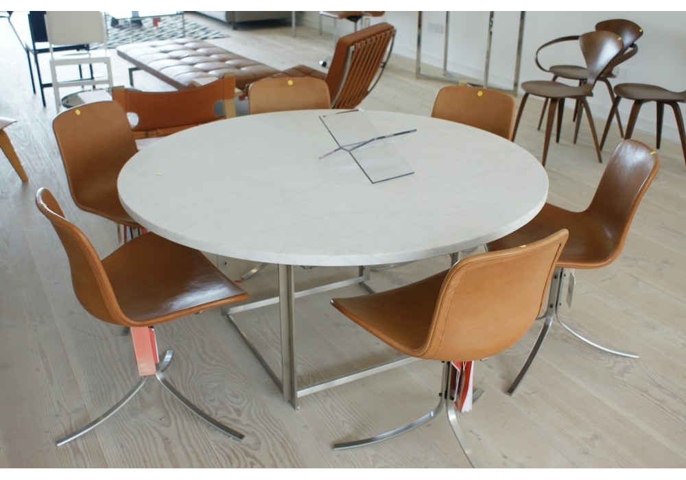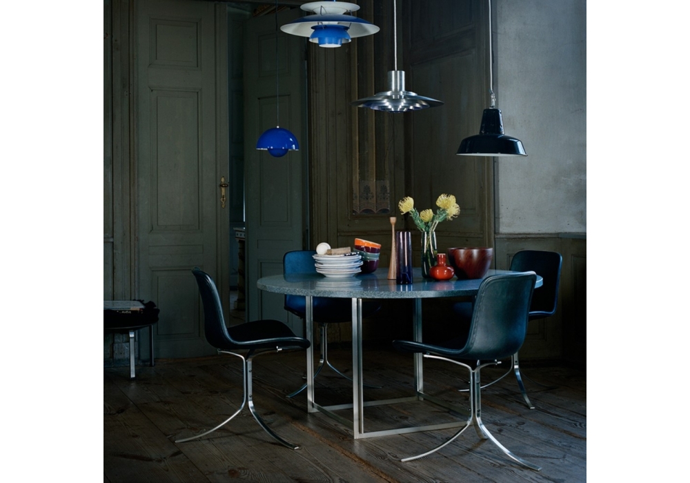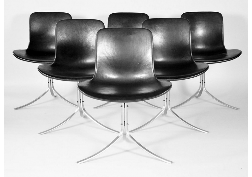 PK9 conçue par Poul Kjærholm pour Fritz Hansen est une chaise entièrement rembourrée en cuir. La base à trois pieds est en acier inoxydable satiné brossé.
