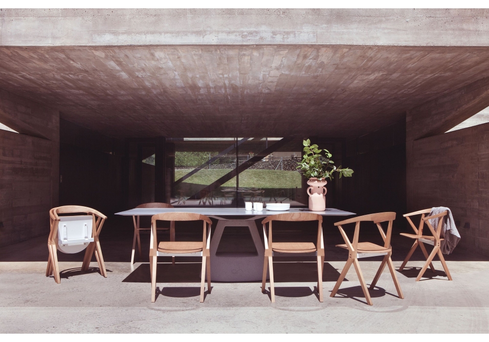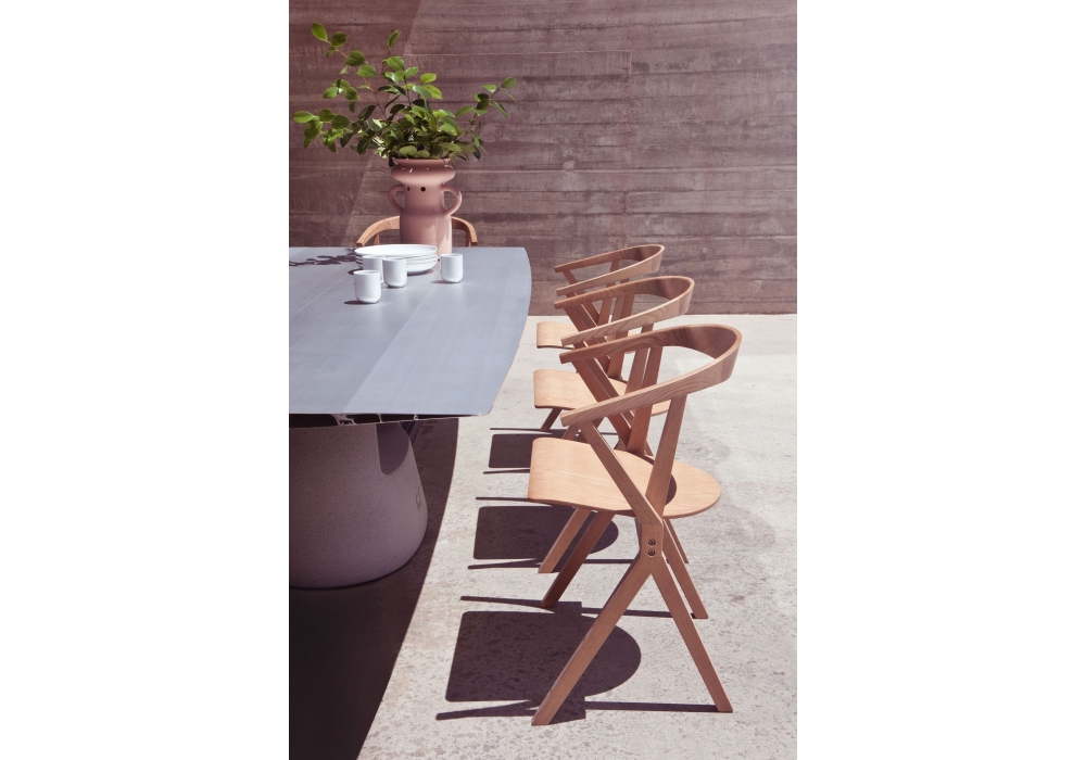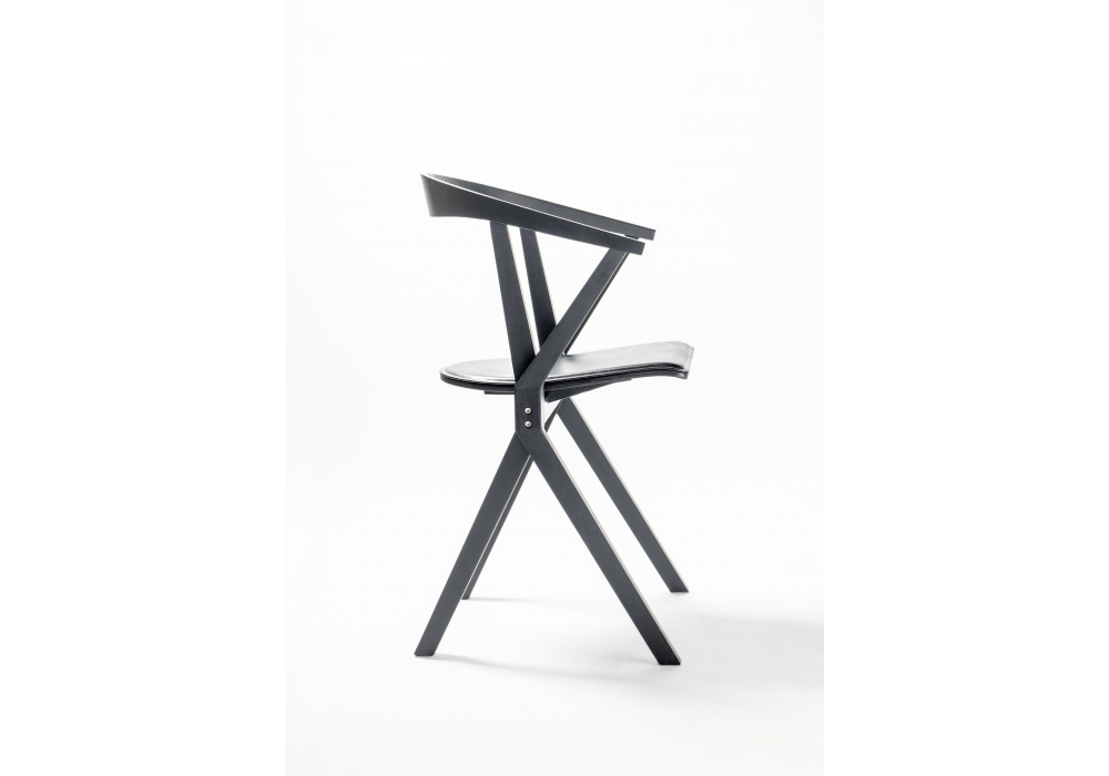 Chair B conçue par Konstantin Grcic pour BD Barcelona est une chaise en contreplaqué de hêtre plaqué. La partie inférieure est plaquée de frêne et le dossier est en frêne massif. La structure inférieure est en tube d'acier et pièces en fonte d'aluminium laquées en blanc ou noir.