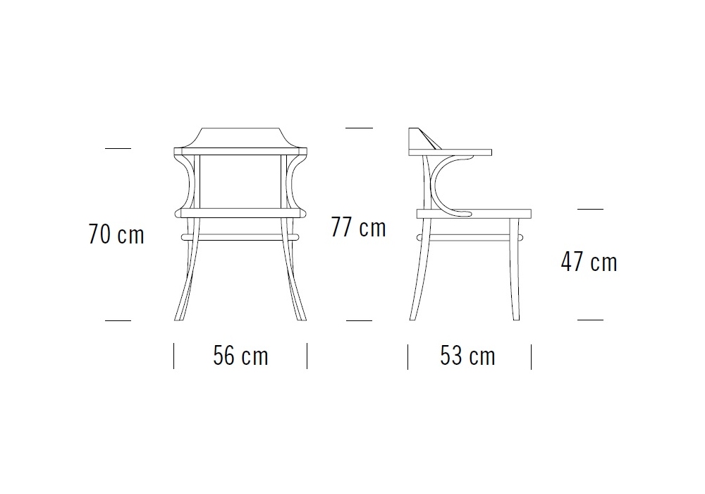 233 P conçue par Gebrüder Thonet pour Thonet est une chaise avec accoudoirs en bois courbé. Assise rembourrée avec revêtement en tissu, cuir ou cuir. Structure en hêtre, disponible en différentes finitions.