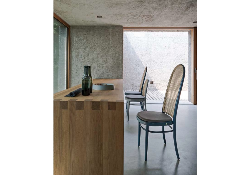 Morris conçue par Gamfratesi pour Gebrüder Thonet Vienna est une chaise en hêtre courbé avec un dossier haut en paille de Vienne. Assise rembourrée en tissu ou en cuir. La chaise est également disponible en deux tailles.