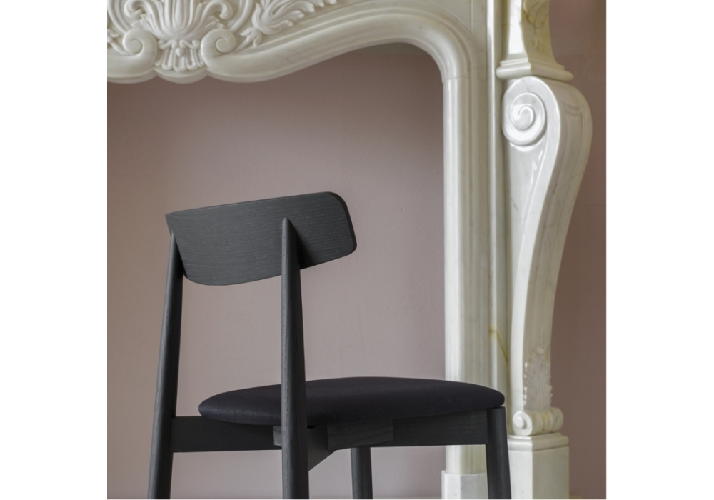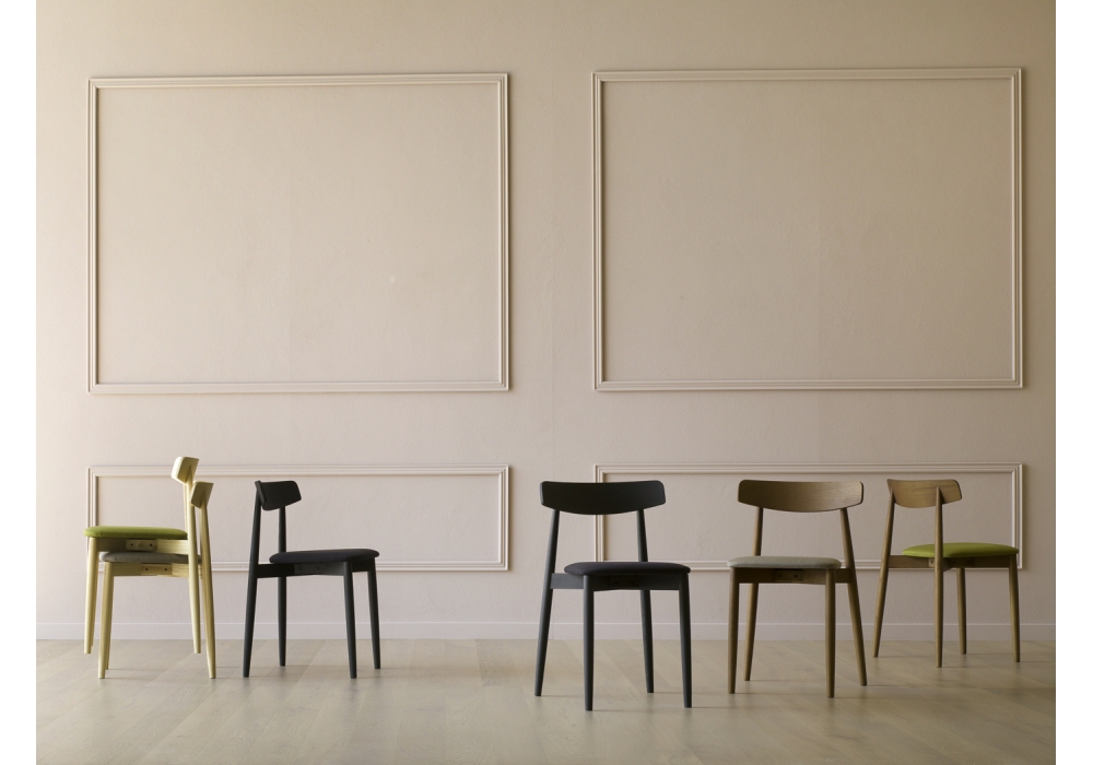 Claretta conçue par Florian Schmid pour Miniforms est une chaise empilable avec structure en bois de frêne laqué ou aniline disponible en différentes couleurs. Assise en tissu.