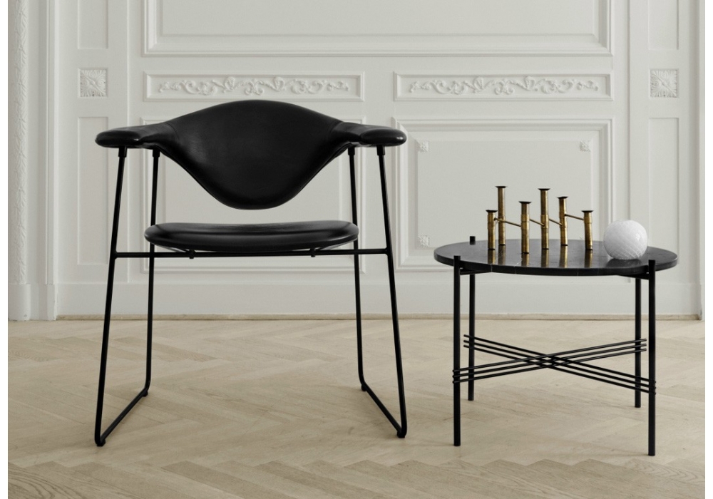 Masculo Lounge conçue par GamFratesi pour Gubi est une chaise réalisée avec structure en acier et revêtement en tissu ou cuir.