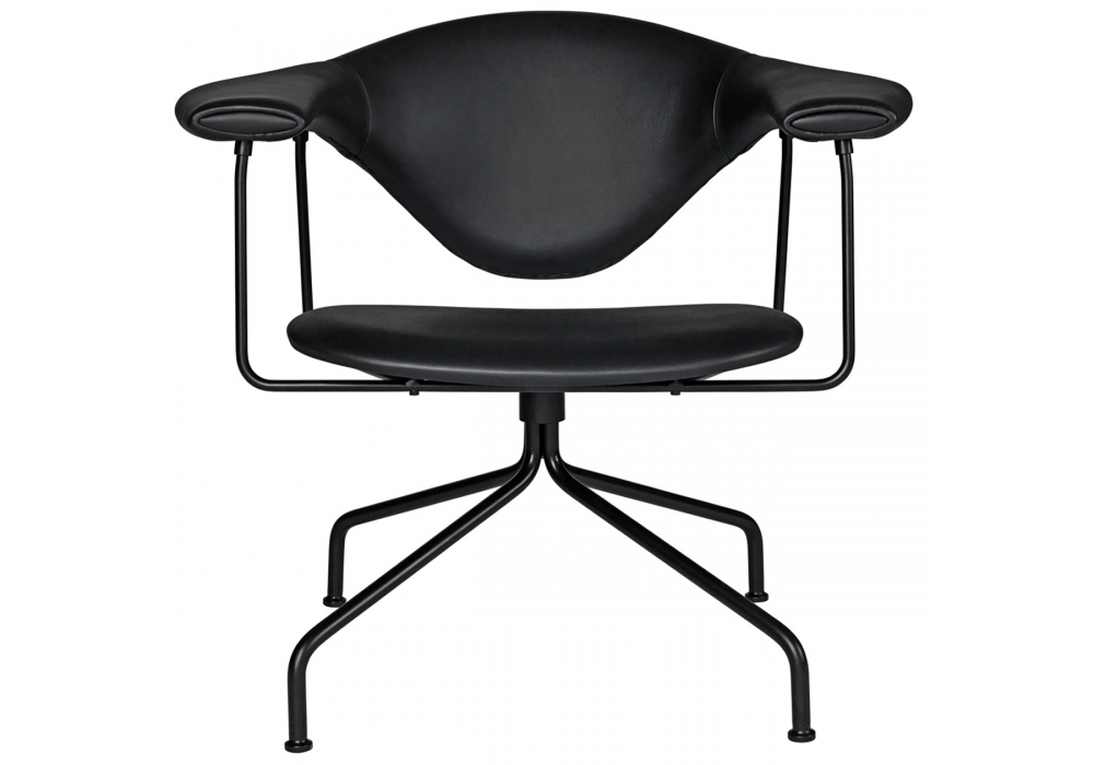 Masculo Lounge conçue par GamFratesi pour Gubi est une chaise avec base pivotante réalisée avec structure en acier noir semi-mat et revêtement en tissu ou cuir.