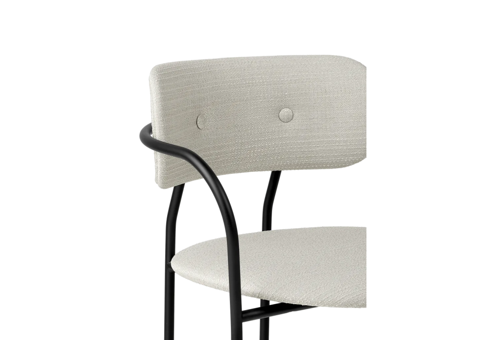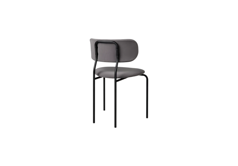 Coco conçu par OEO Studio pour Gubi est une chaise avec assise et dossier en contreplaqué moulé entièrement recouvert de tissu ou de cuir et base noir. Disponible en différentes finitions, avec ou sans accoudoirs.