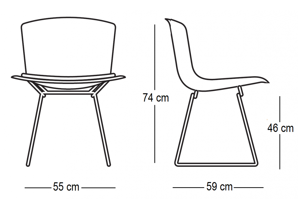 Bertoia conçue par Harry Bertoia pour Knoll est une chaise entièrement recouverte de tissu ou de cuir. La structure est constituée de tiges d'acier soudées à chaque intersection. Disponible en différentes finitions.