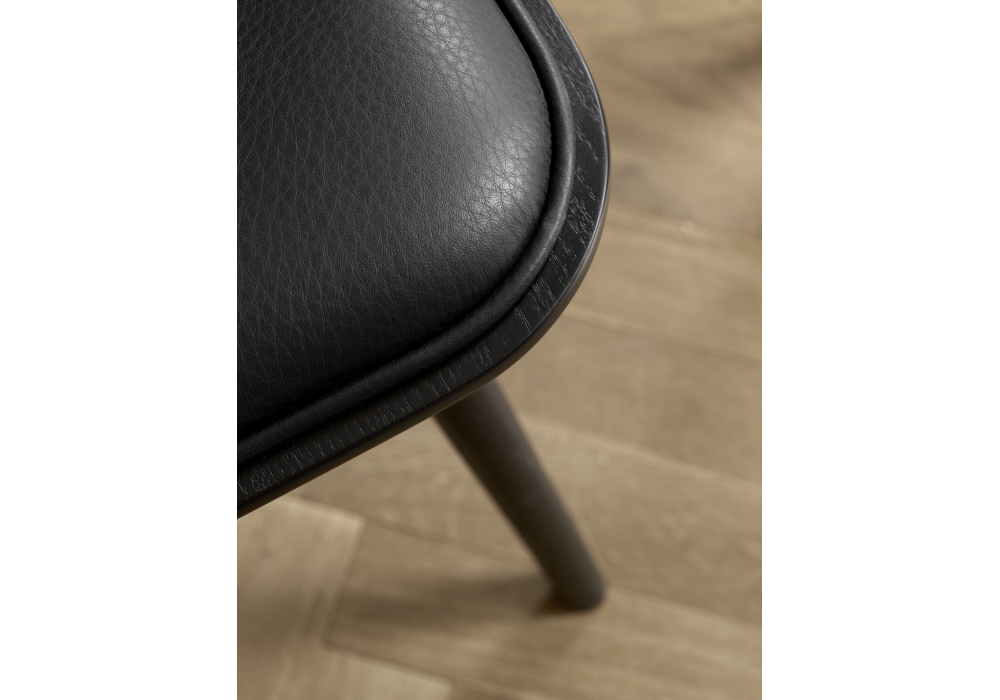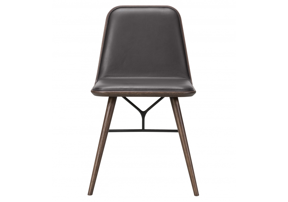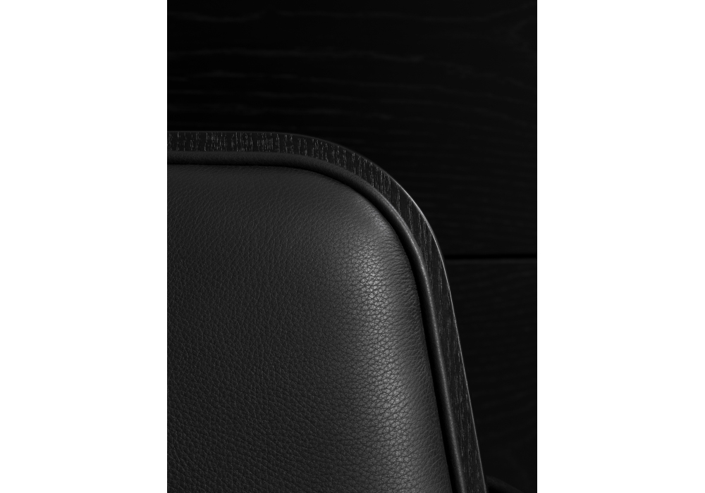 Spine conçue par Space Copenhagen pour Fredericia est une chaise avec structure en chêne massif ou en frêne avec support en métal thermolaqué. Coque d'assise en contreplaqué avec âme en hêtre. Face avant de la coque d'assise rembourrée de mousse et recouverte de tissu ou de cuir, terminée par un passepoil.