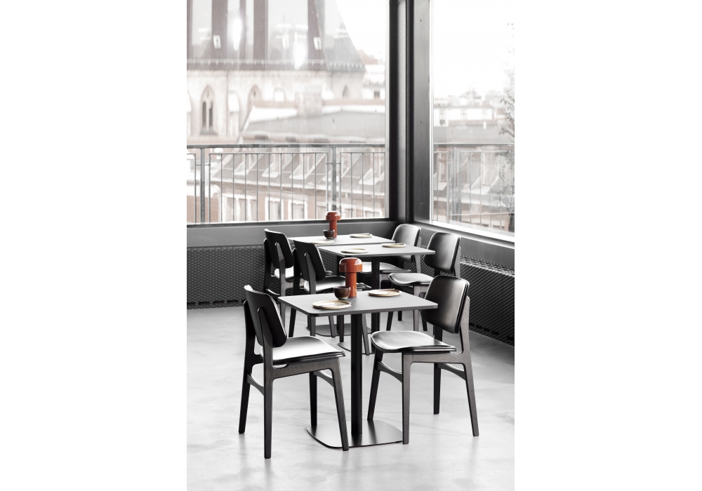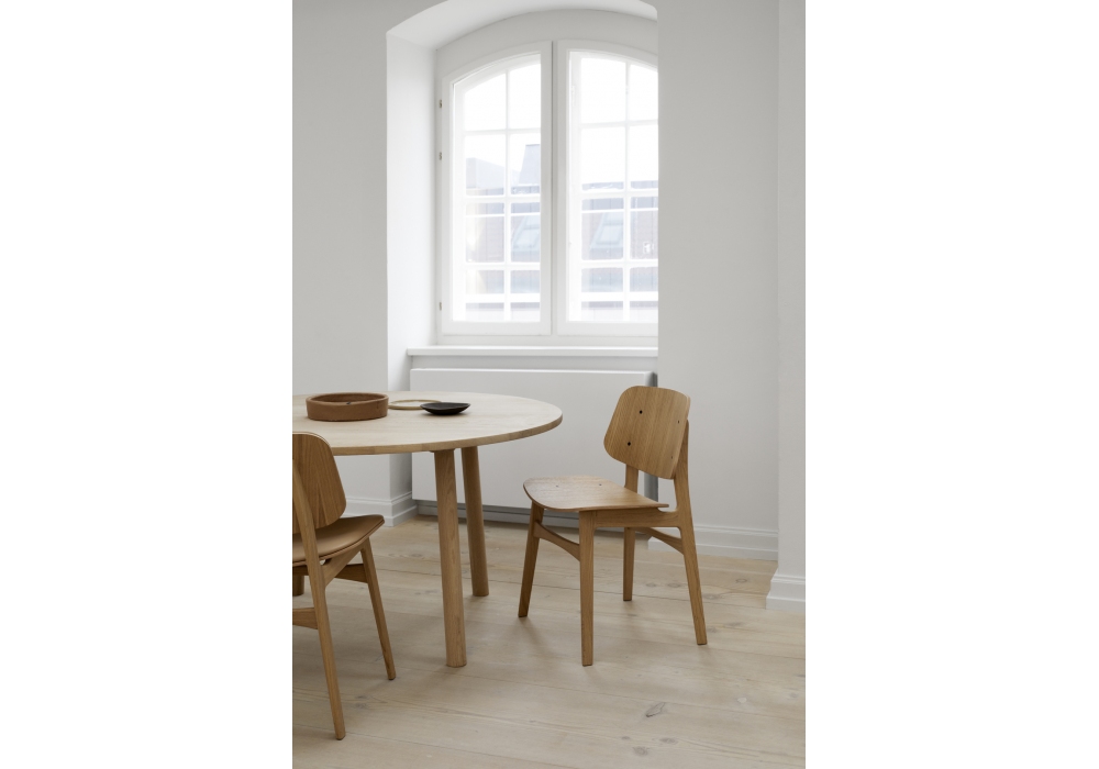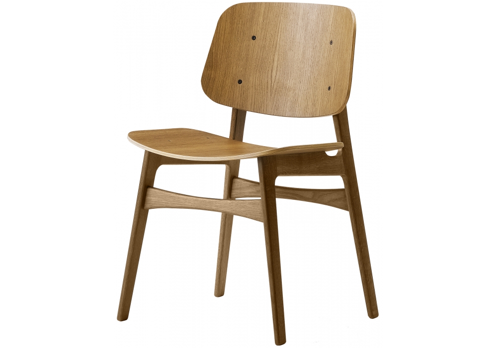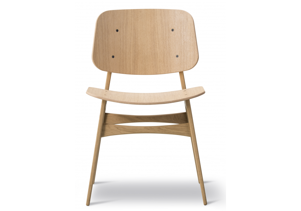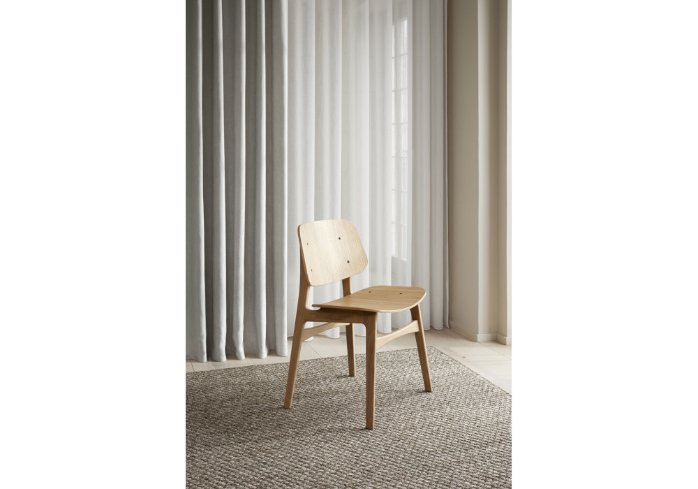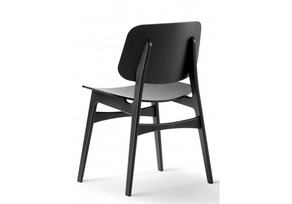 Søborg conçue par Børge Mogensen pour Fredericia est une chaise avec structure en chêne ou noyer massif, assise et dossier en contreplaqué profilé. Assise et dossier interchangeables montés avec des vis en métal noir.