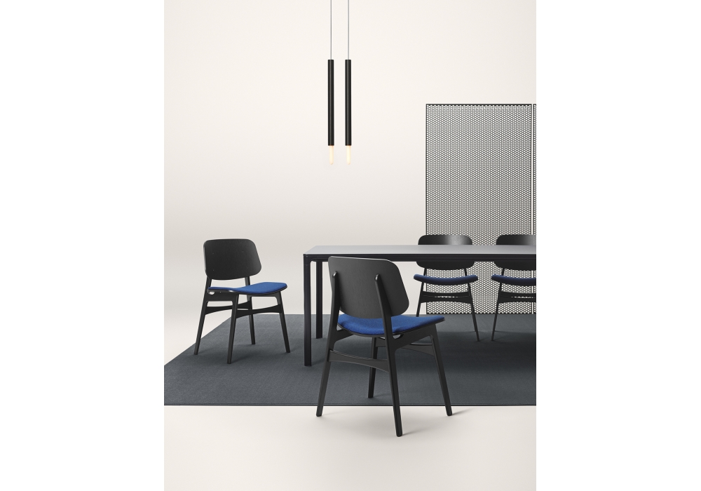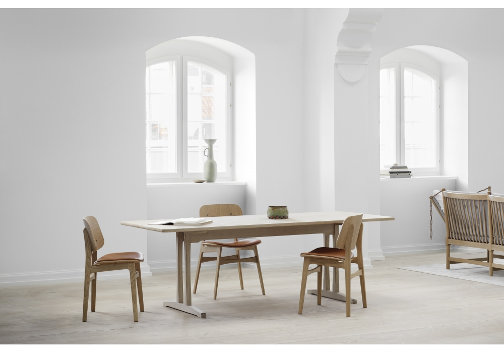 Søborg conçue par Børge Mogensen pour Fredericia est une chaise rembourrée avec structure en chêne ou noyer massif. Coussin d'assise interchangeable rembourré de mousse avec revêtement fixe en tissu ou cuir.