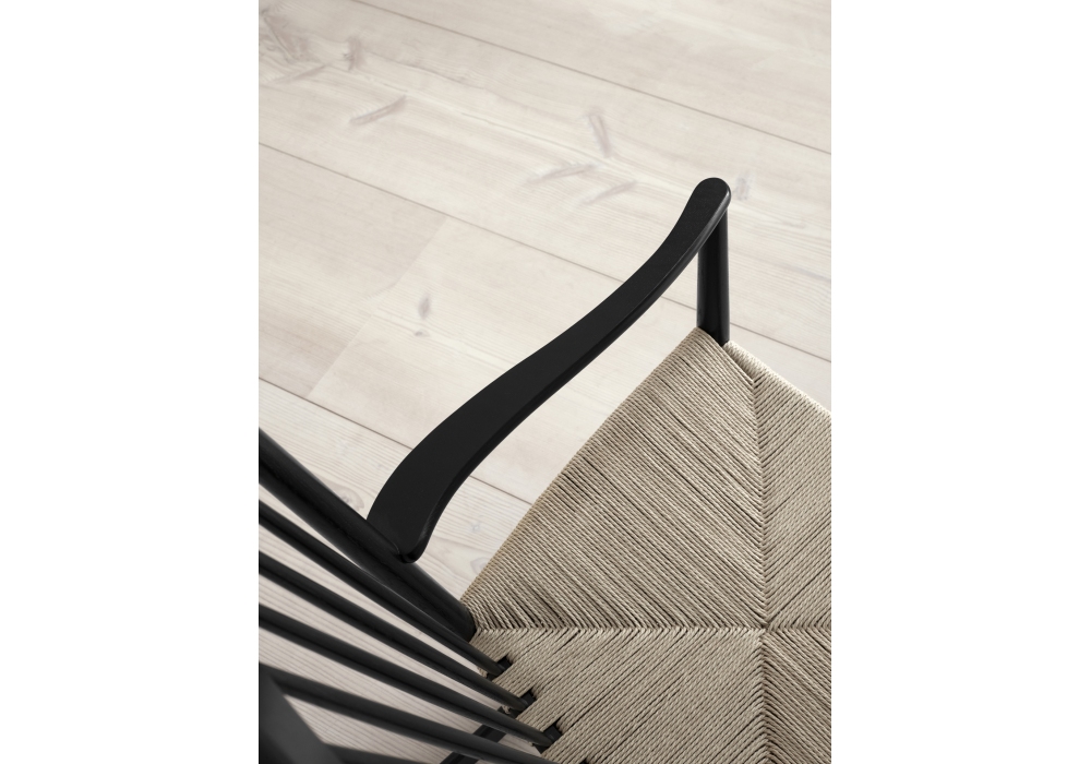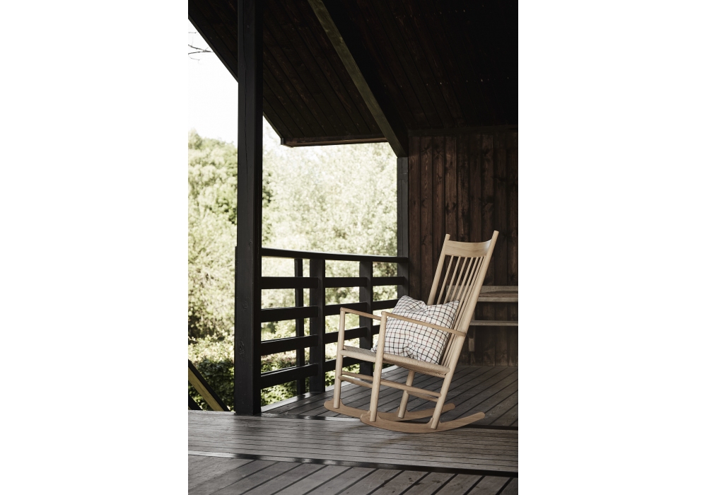 Wegner J16 conçue par Hans J. Wegner pour Fredericia est une chaise à bascule en bois de chêne ou de noyer massif. Siège en corde de papier tressé en finition naturelle ou noire.