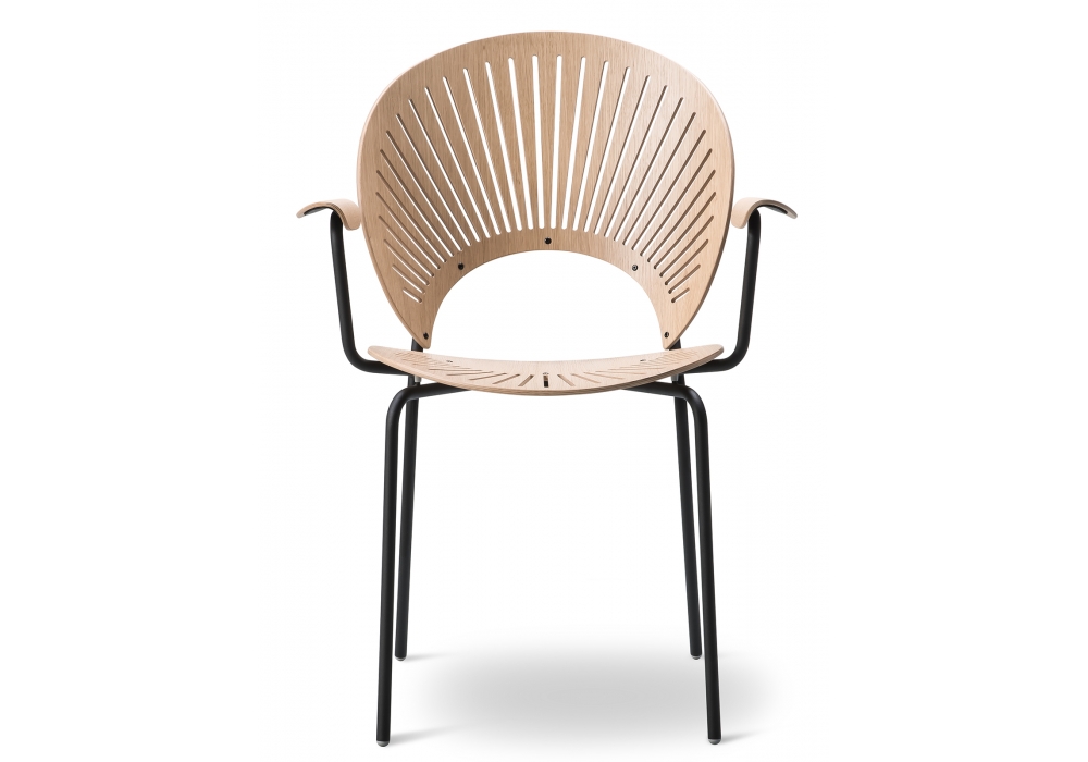 Trinidad conçue par Nanna Ditzel pour Fredericia est une chaise avec structure en tube d'acier et dossier en contreplaqué modélisé avec des découpes fraisées CNC. Assise et dossier montés avec des rivets. Disponible avec ou sans accoudoirs.