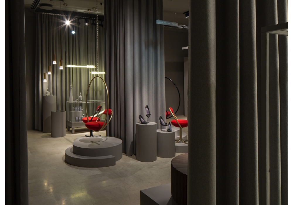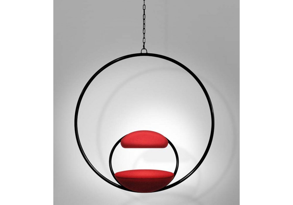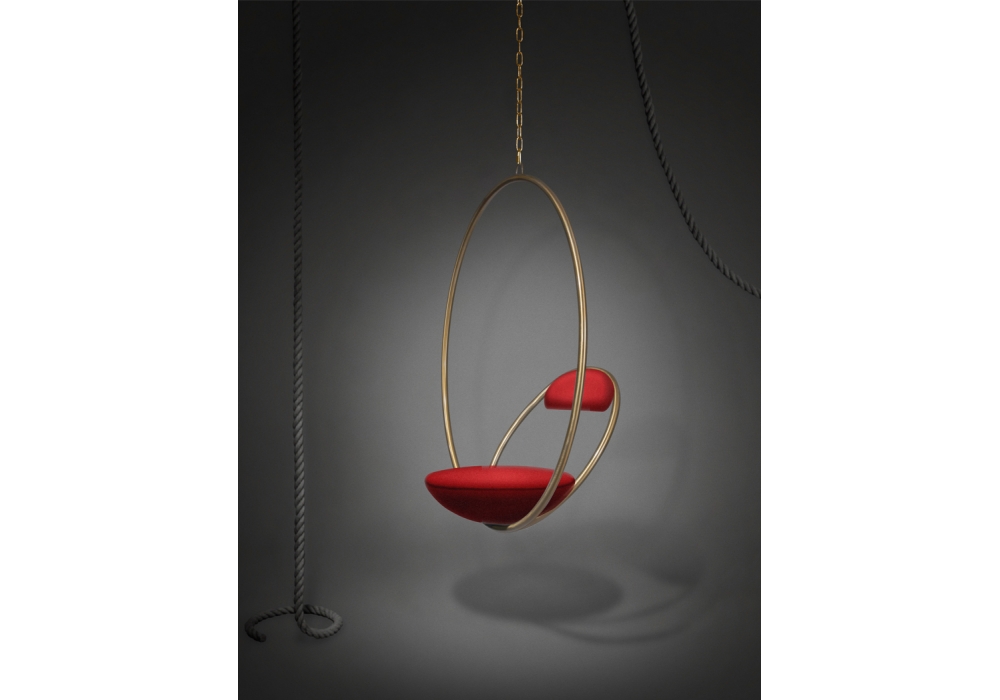 Hanging Hoop Chair conçu et produit par Lee Broom est une chaise suspendue composée de deux cercles concentriques en acier noir ou en laiton. L'assise et le dossier sont recouverts de tissu Kvadrat rouge.