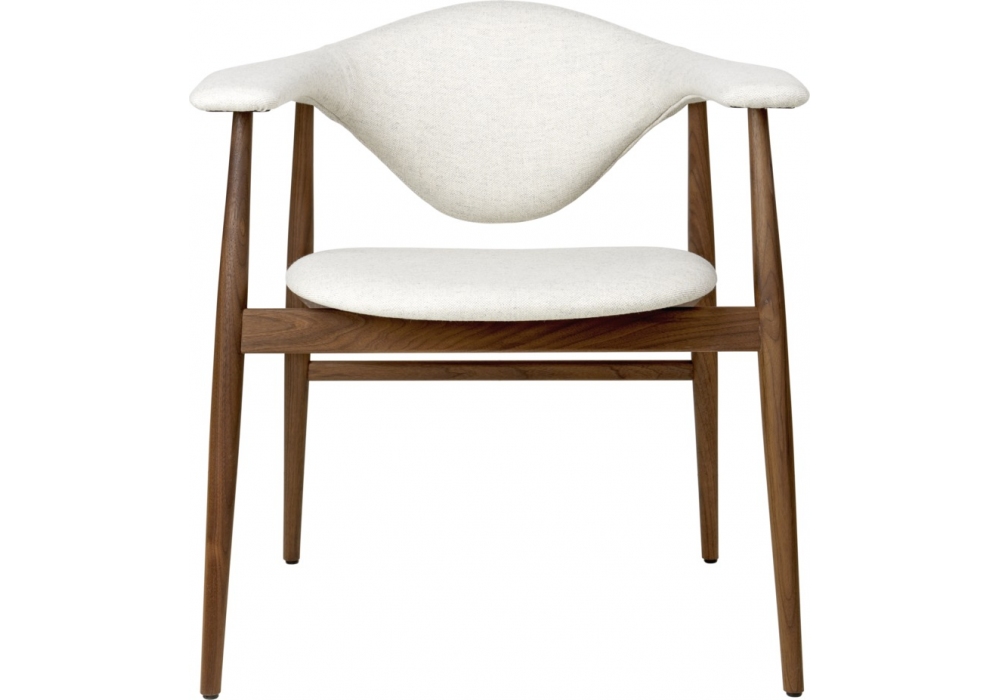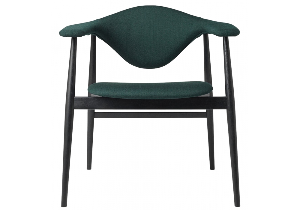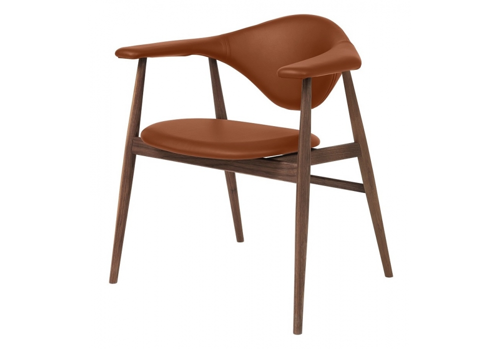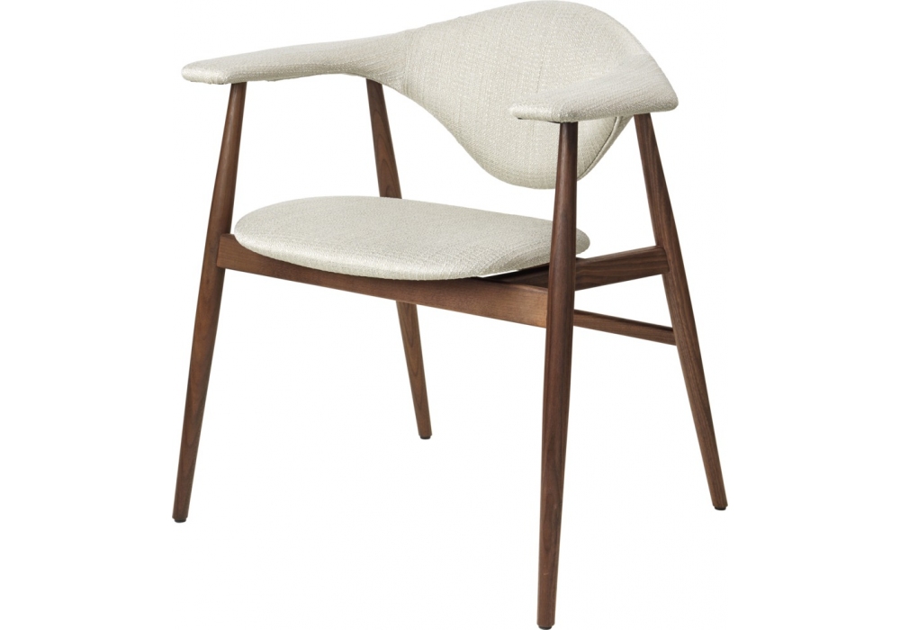 Masculo conçue par GamFratesi pour Gubi est une chaise avec base en bois disponible en différentes finitions. Revêtement disponible en différents types de tissu et cuir.