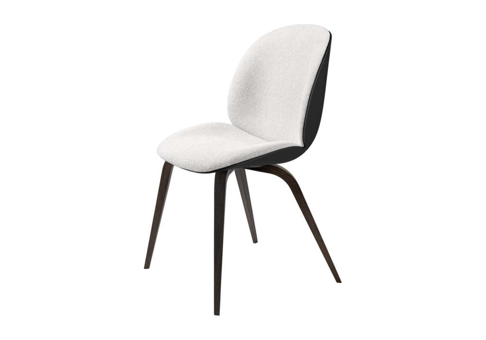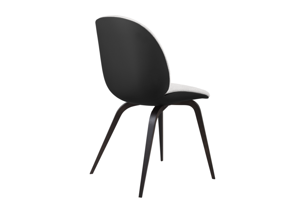 Beetle conçue par GamFratesi pour Gubi est une chaise avec base en bois de chêne, noyer ou hêtre. Revêtement disponible en différents types de tissus et cuirs. Coque en polypropylène disponible en différentes finitions.