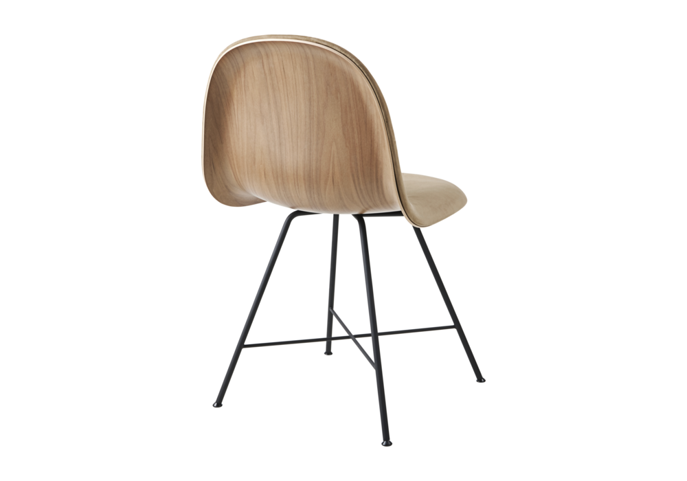 3D conçue par Komplot Design pour Gubi est une chaise avec coque en bois et base noir. Revêtement disponible en tissu ou cuir.