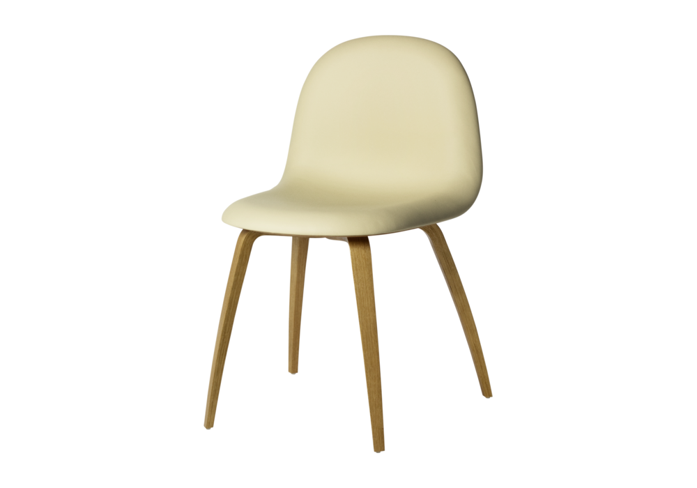 3D Dining conçue par Komplot Design pour Gubi est une chaise avec base et coque en bois. Revêtement avant en tissu ou cuir.