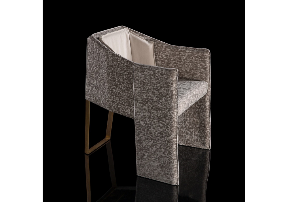 Ketch conçue par Massimo Castagna pour Henge est une chaise avec jambe arrière en acier au fini laiton bruni. Revêtement en cuir.