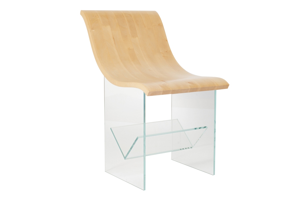 Synnefo par Salvatore Longo pour Ornythos est une chaise avec une coque en bois d'érable et une base en verre trempé.