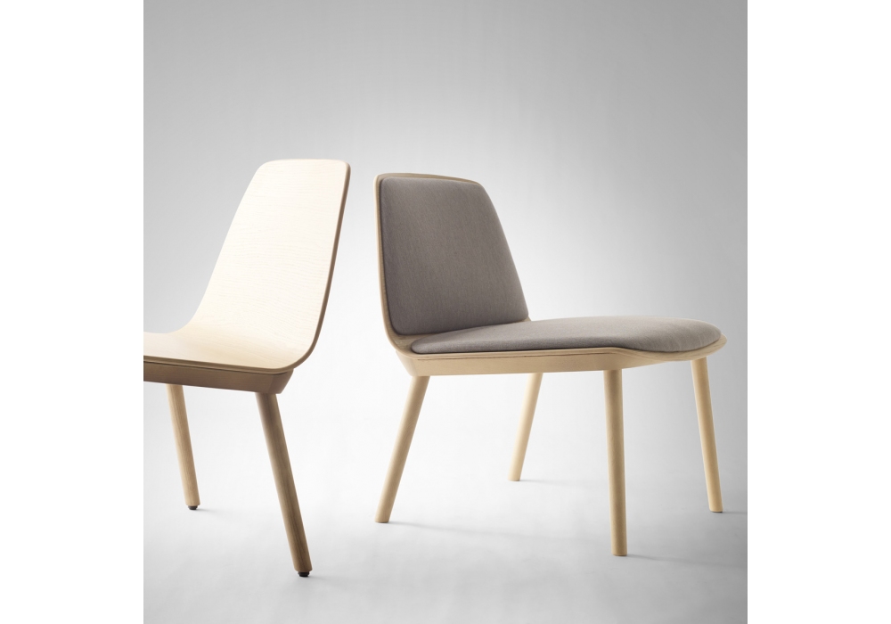 Bisell Lounge conçu par Estudi Manel Molina pour Treku est une chaise avec coque rembourrée en bois, disponible dans différentes finitions. L'assise est disponible avec un rembourrage en tissu dans différentes nuances.