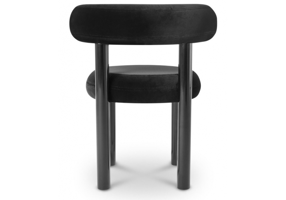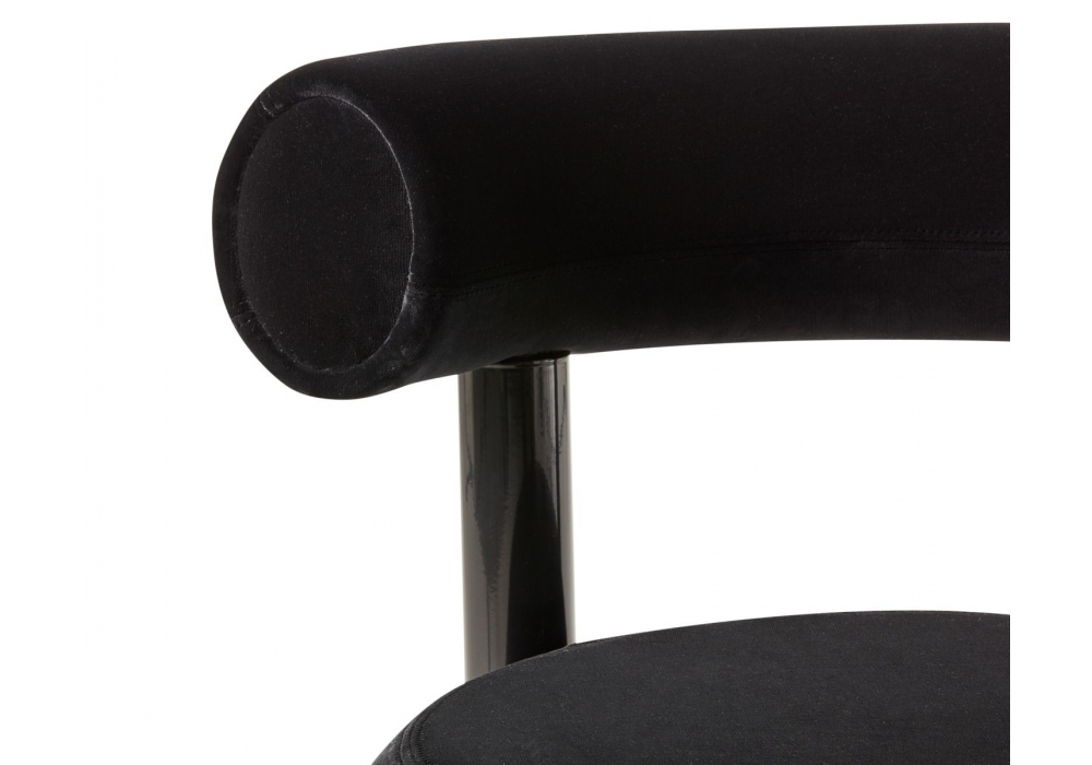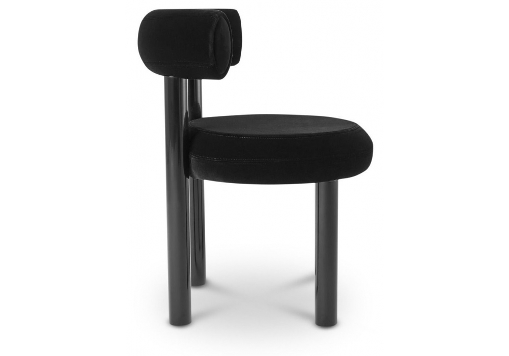 Fat Dining Chair conçue par Tom Dixon est une chaise de salle à manger avec assise et dossier rembourrés en mousse moulée et recouverts de tissu. Structure en acier thermolaqué noir brillant.