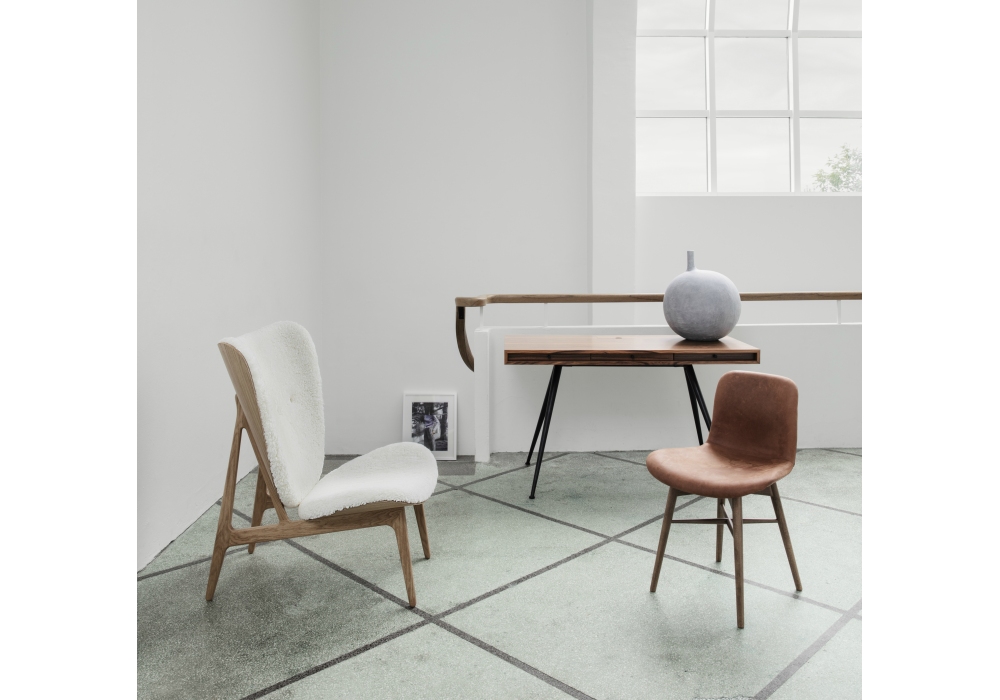 Langue Original conçue par Rune Krøjgaard et Knut Benedik Humlevik pour Norr11 est une chaise avec base en bois de hêtre et la coque disponible avec revêtement en tissu ou en cuir.