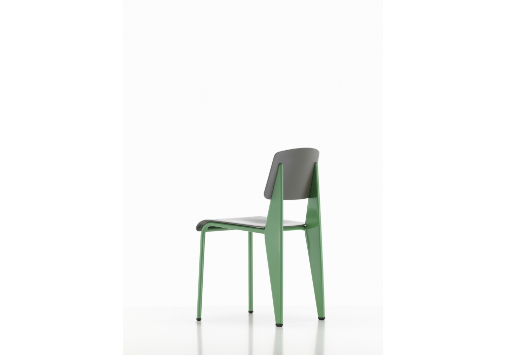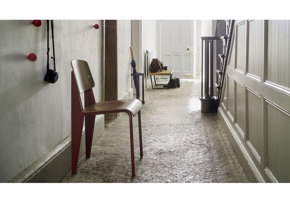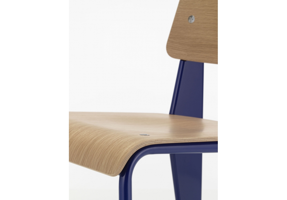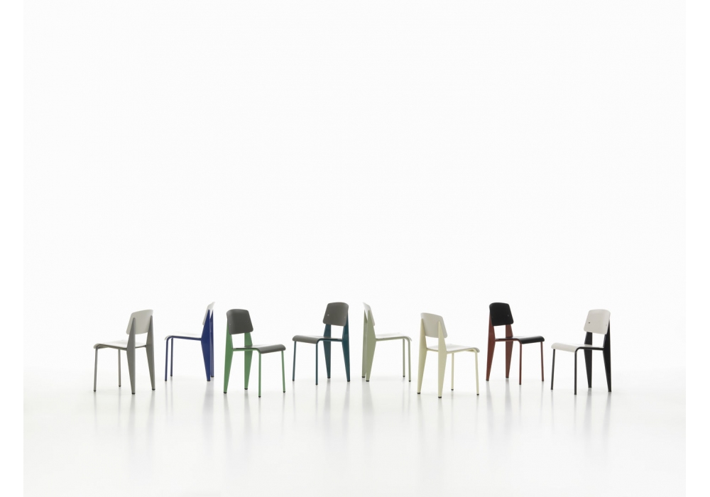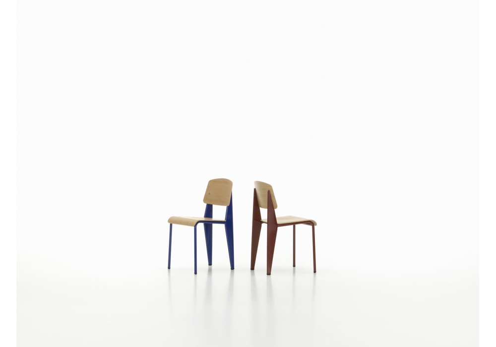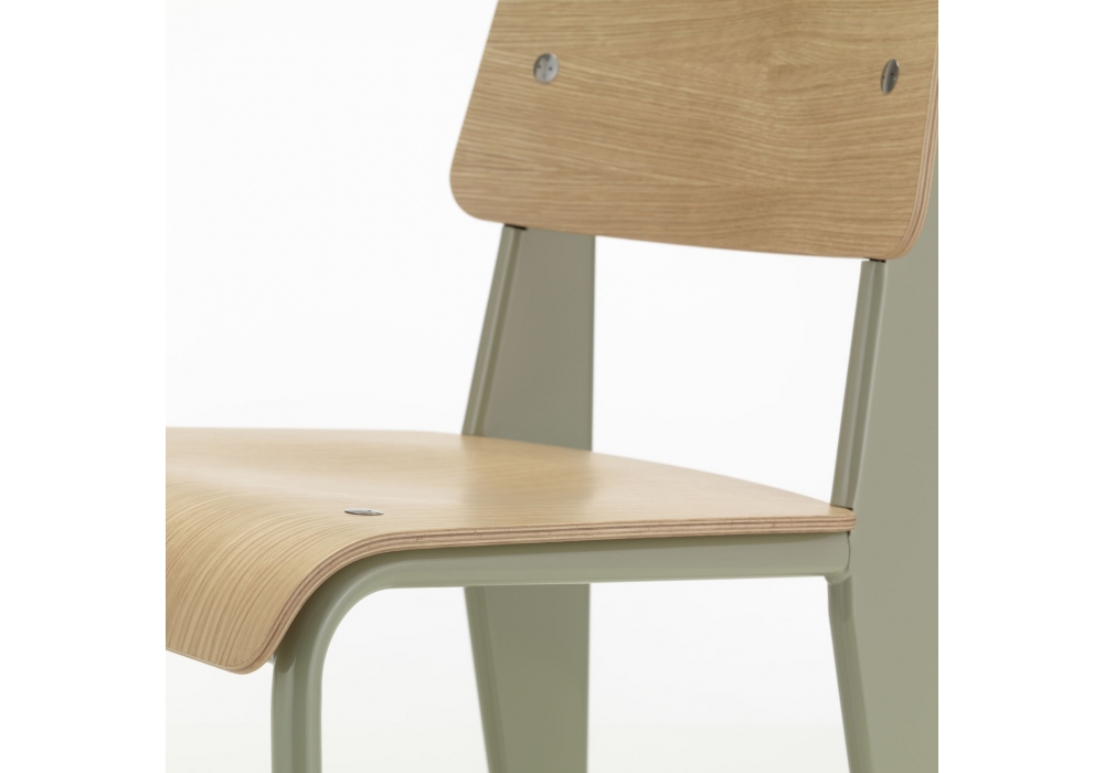 Standard conçue par Jean Prouvé pour Vitra est une chaise réalisée avec assise et dossier en bois de chêne ou de noyer et base en tôle d'acier pliée et tube d'acier avec finition thermolaquée (lisse). Disponible en différentes finitions.
