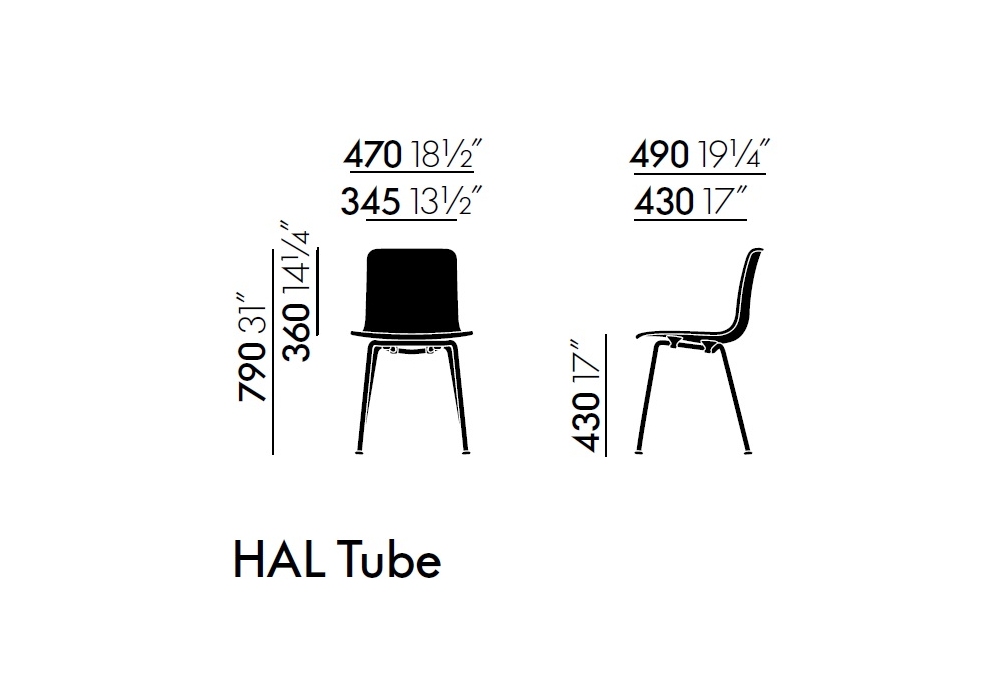 HAL RE Tube conçue par Jasper Morrison pour Vitra est une chaise avec base en tube d'acier à quatre pieds, non empilable, chromée ou peinte en poudre de couleur ivoire ou basic dark. Coque en polypropylène recyclé teint dans la masse et coussin en tissu.