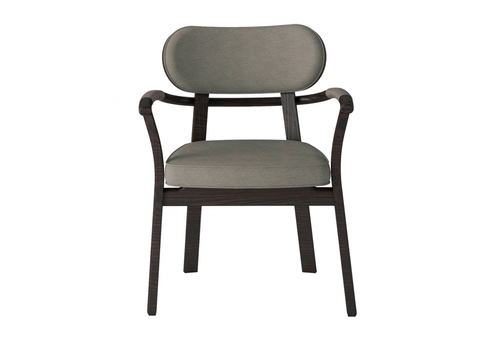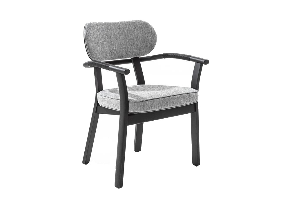 Evelin conçue par Carlo Ballabio pour Porada est une chaise avec accoudoirs. Structure laquée frêne ou pore ouvert, revêtement en tissu et accoudoirs recouverts de cordon en cuir.