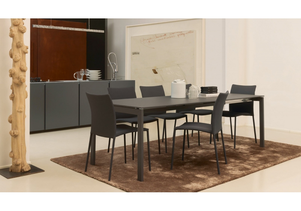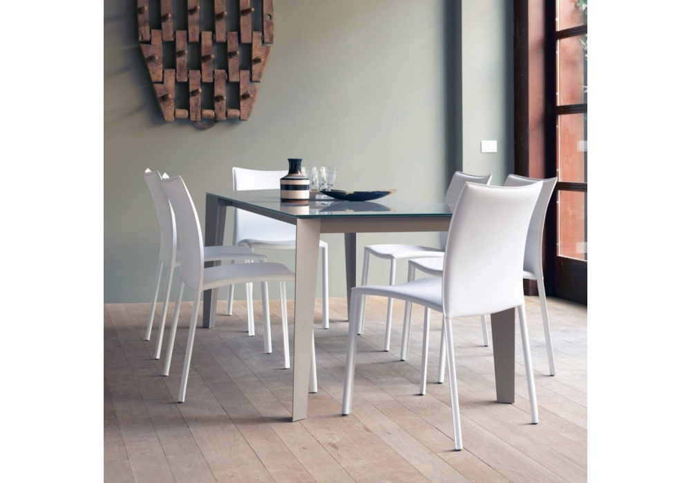 Simba conçu par R&D Bontempi Casa est une chaise avec structure en acier entièrement recouverte disponible en différentes finitions et matériaux de rembourrage.