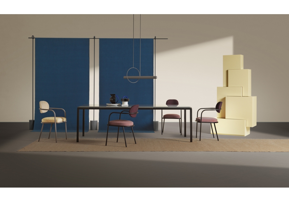 Ula conçue par Serena Confalinieri pour My Home Collection est une chaise avec structure en acier tubulaire peint. L'assise et le dossier sont en caoutchouc polyuréthane et doublure en fibre de polyester. Le revêtement est en tissu uni ou bicolore dans différentes finitions.