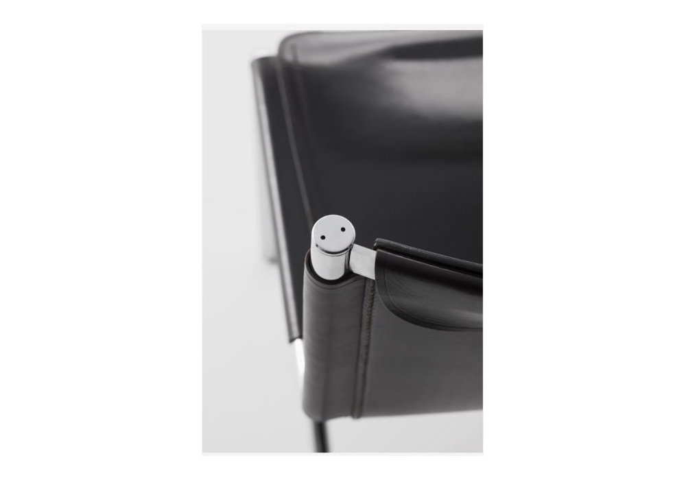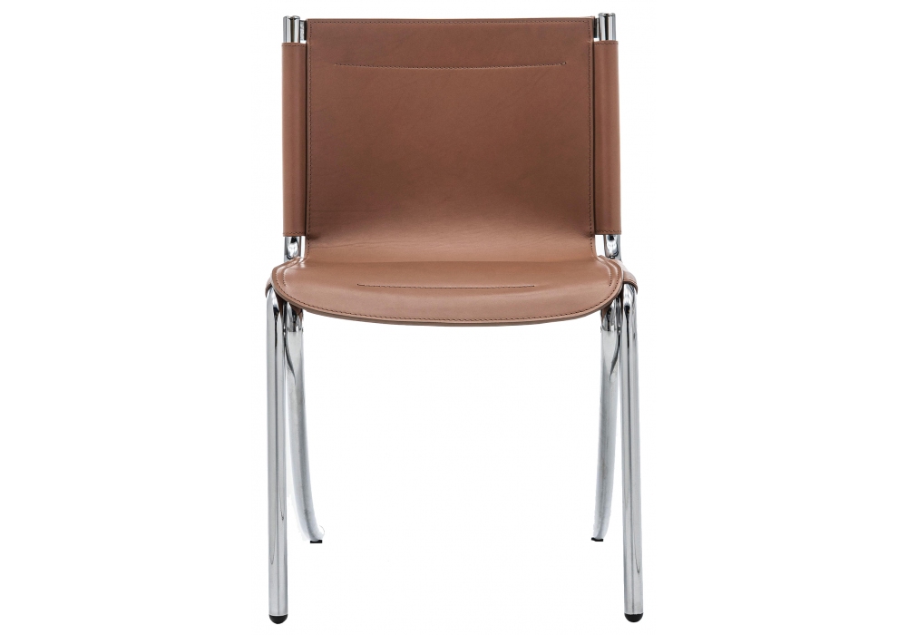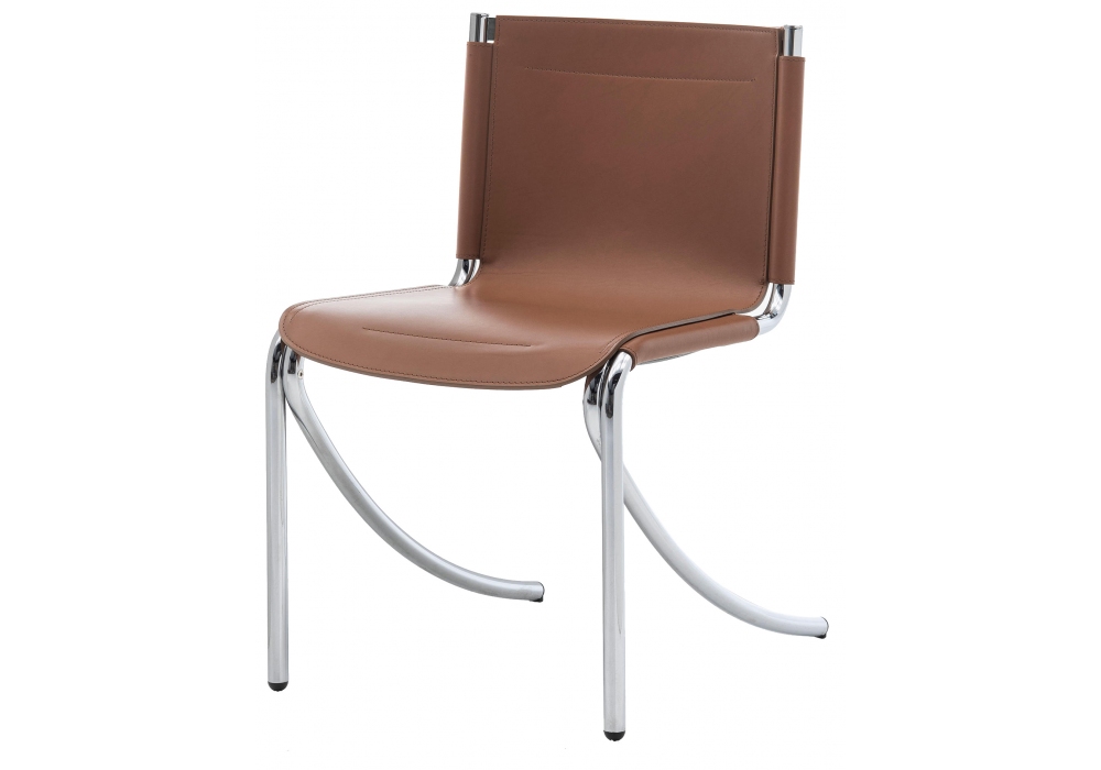 Jot conçue par Giotto Stoppino pour Acerbis est une chaise à structure métallique disponible en chrome ou nickel noir et revêtue en cuir de selle de différentes couleurs.