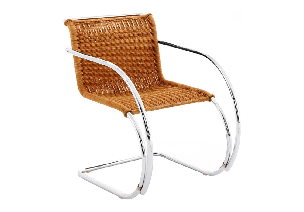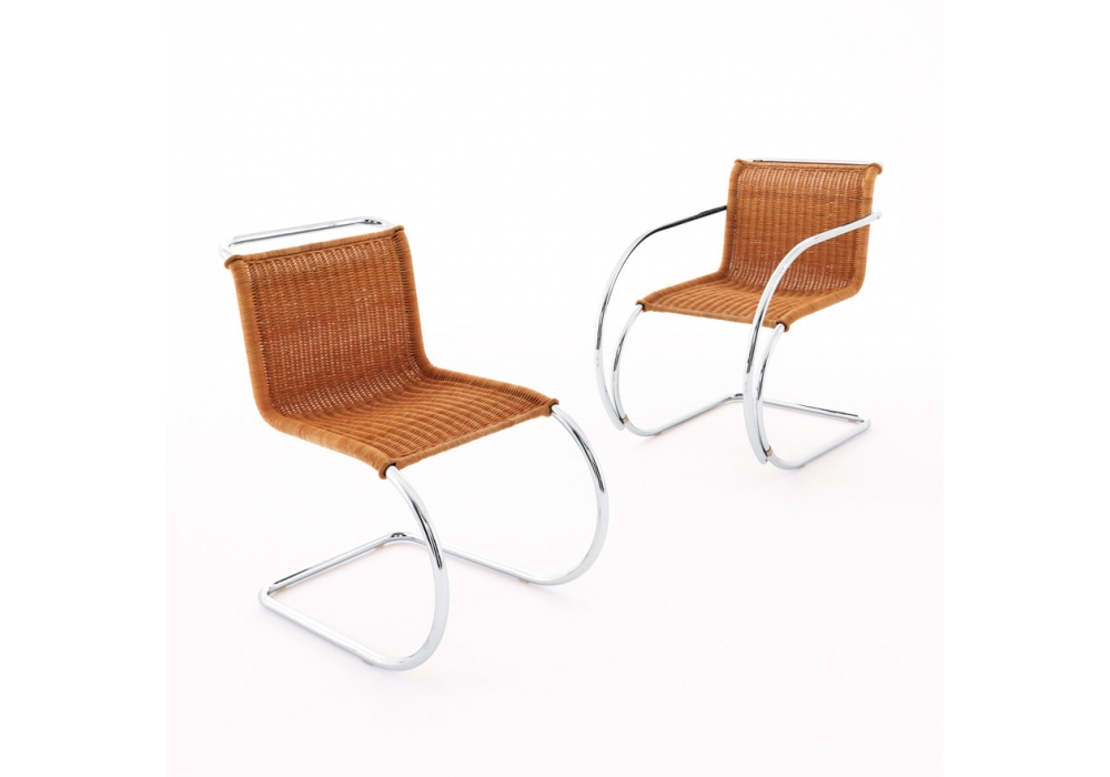 MR Rattan, conçue par Ludwig Mies van der Rohe pour Knoll, est une chaise avec une structure en tube d'acier en finition chrome poli ou époxy ultra mat. Revêtement en osier.