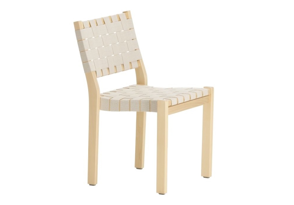 Chair 611 conçue par Alvar Aalto pour Artek est une chaise réalisée avec structure en bouleau massif, assise et dossier en sangle de lin. Disponible en différentes finitions.