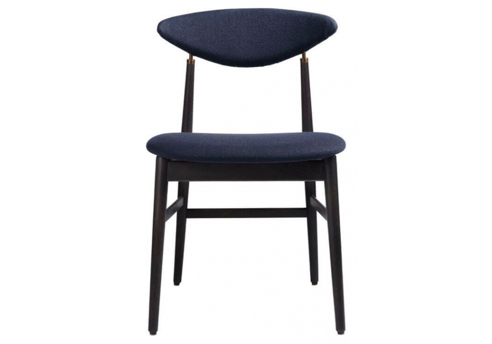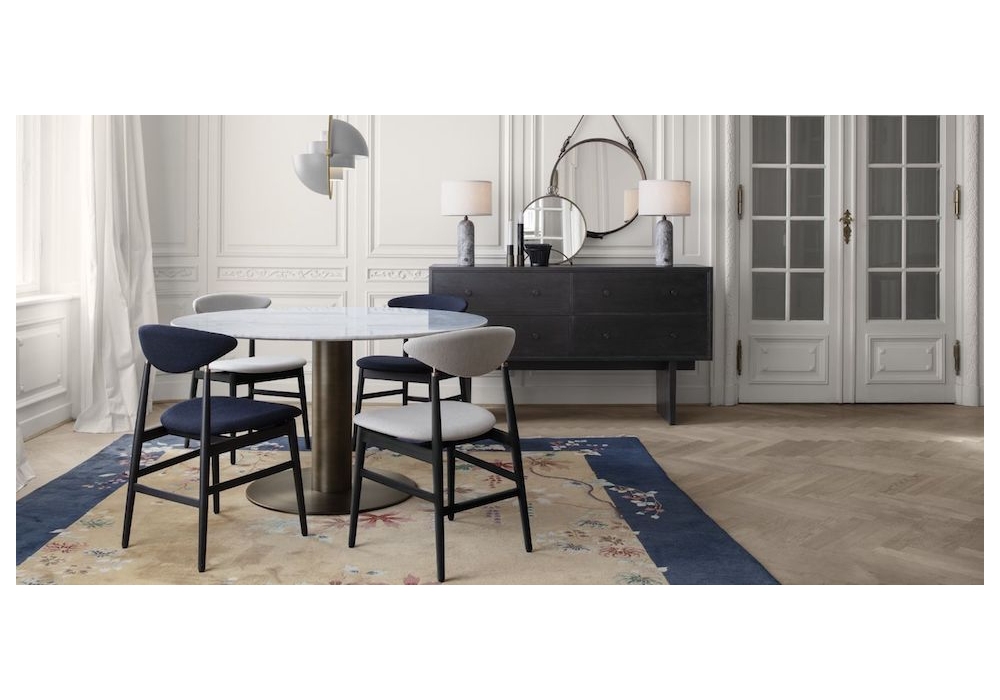 Gent conçue par GamFratesi pour Gubi est une chaise de salle à manger composée d'une structure en bois et d'une assise et d'un dossier rembourrés en cuir ou en tissu.