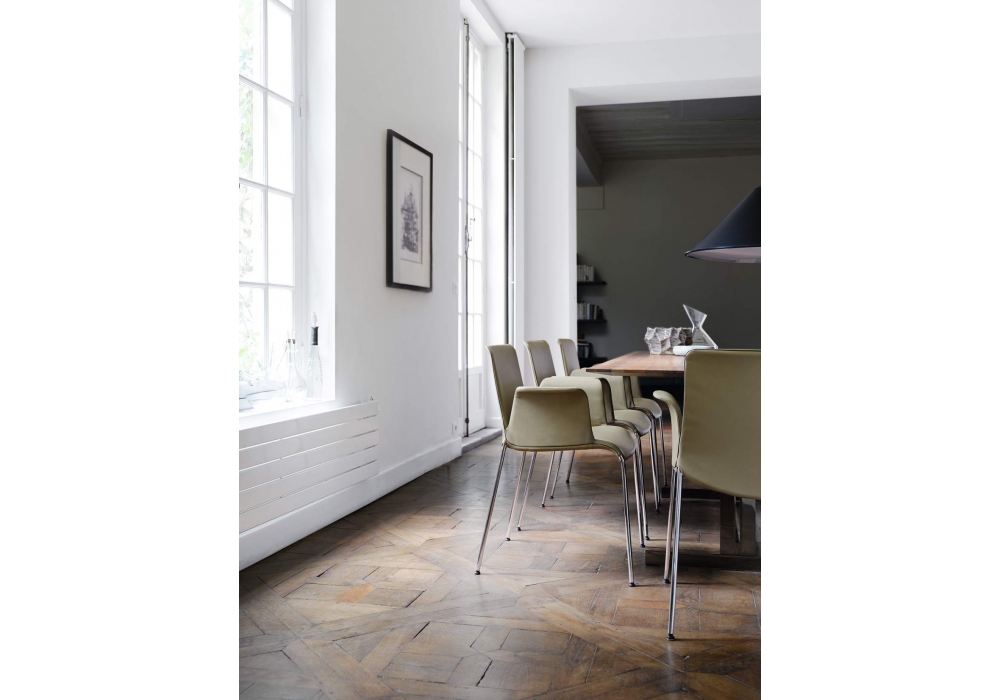 Liz conçue par Claudio Bellini pour Walter Knoll est une collection de chaises avec base à quatre pieds en acier chromé verni ou poli. Revêtement en tissu ou en cuir. Disponible avec dossier bas ou haut, avec ou sans accoudoirs et version capitonnée.
