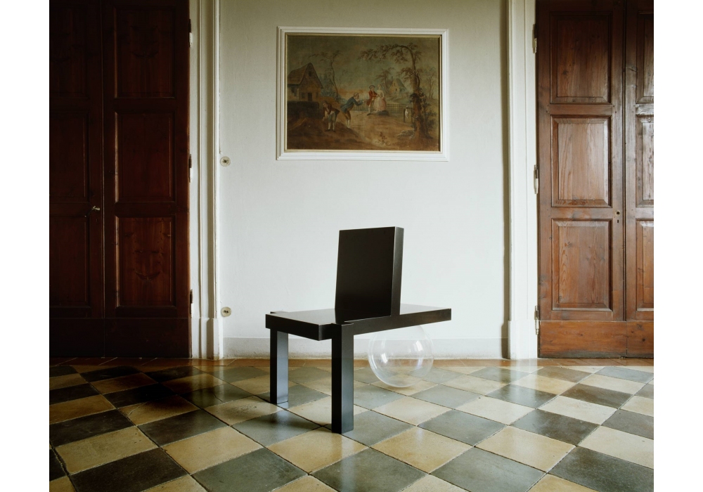 Harry conçue par Bill Woodrow pour Memphis Milano est une chaise en bois laqué noir avec sphère en plexiglas.