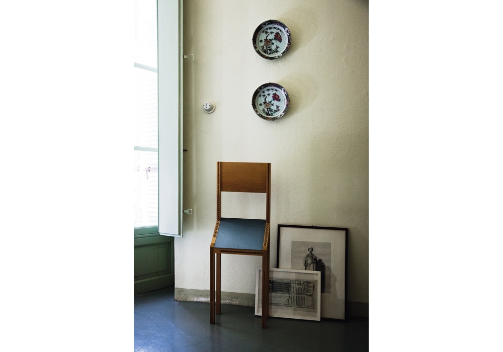 5000 Singer conçue par Bruno Munari pour Zanotta Edizioni est une chaise réalisée avec une structure en noyer ciré, couleur naturelle avec incrustations, assise en aluminium anodisé. Chaque série présente une couleur de siège différente. Neuf exemplaires numérotés et signés.